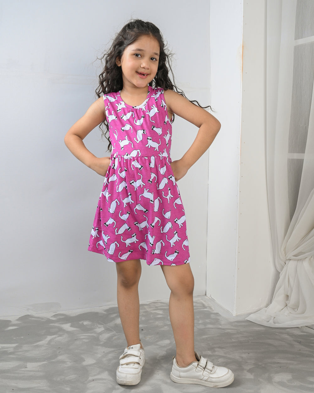 Add some fun to your little one's wardrobe with this adorable Kids Cat Print Dress. Perfect for casual outings, this dress features a vibrant pink color with a playful white cat pattern. The sleeveless design ensures comfort and breathability, while the soft fabric feels gentle on the skin all day long. Ideal for playdates, school events, or just lounging around, this dress is a must-have for your child’s closet.